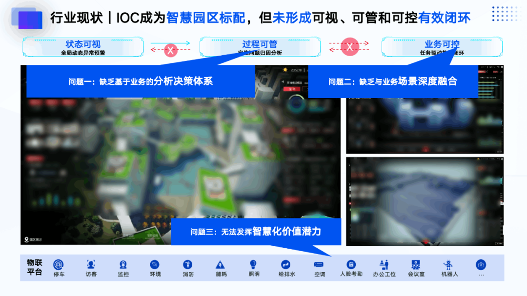 近年来,为实现多业态、跨园区的一体化高效管控,众多企业不惜投入重金打造IOC大屏。然而,多数IOC仅实现了园区数据的初步整合与可视化呈现,在如何有效运用这些数据、精准追踪业务动态变化、深度挖掘核心问题,并以此推动精准决策,达成高效管理闭环等关键环节上,依旧面临着棘手难题。