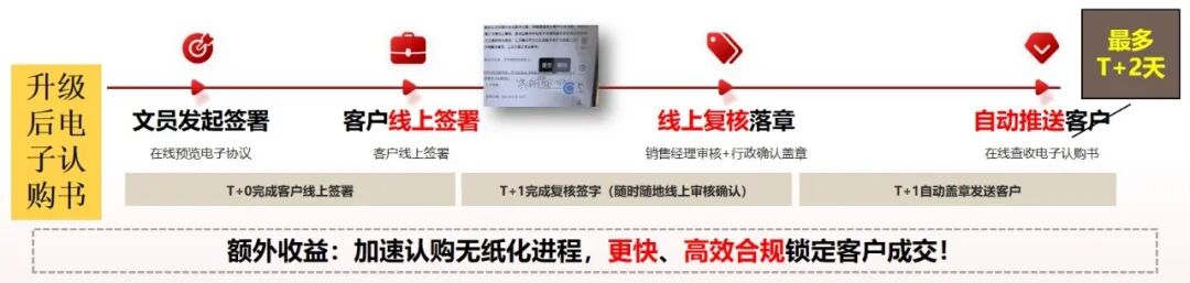 应用电子签章之后,实现了认购合同电子化,从过去多步骤的纸质协议签订流程,简化至只需制定模板、线上签署&线上复核盖章、自动落章归档三个步骤,平均1~2天内即可完成认购合同盖章。同时可在销售系统一键开具电子收据,单张收据整体效率提升80%,在促进线上数据留痕且业务高效的同时,保障了所有销售过程、收款过程的可追踪且合规风控,同时让客户无需等待直接在线获取电子收据,有效优化了客户体验。