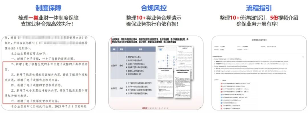 2、业务制度是支撑:引入了多项创新业务场景,通过创新实现业务效率提升、项目成本结余的真实效果。在每一项创新举措的引入同时,充分论证讨论其合规性,再以合规制度的方式发布,从而保障项目的有序推进,并在制度的约束下进行有效管理。