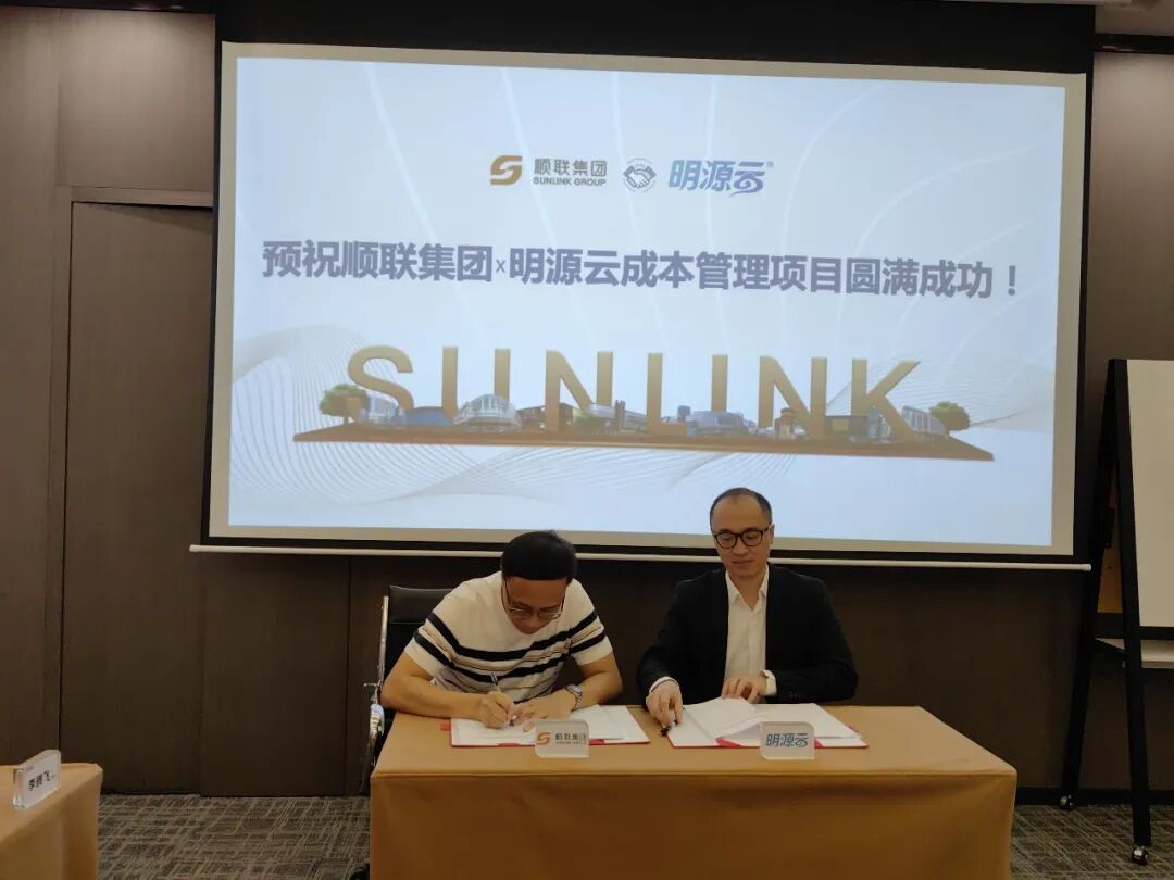▲顺联集团财务中心总经理周俊(左)与明源云佛山区域陈拓(右)共签项目章程