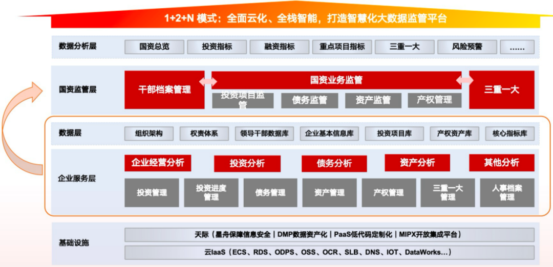 作为都匀市国资监管数字化转型的重点工程,该系统“设计理念先进、功能模块完备”。创新性构建"1+2+N"体系架构(“1”指国资监管一体化数字平台,作为数据汇聚和处理的核心;“2”涵盖国资监管层和企业服务层两个层级;“N”代表国资监管和企业自身的多个业务板块,明确各板块的功能需求和业务流程),实现系统架构的合理布局。