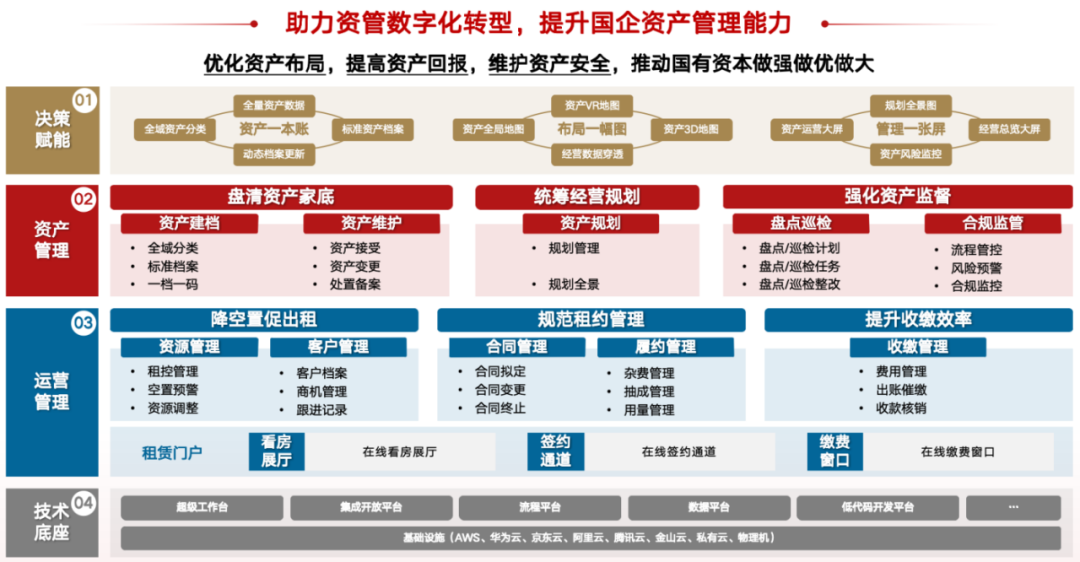 一、资产管理:盘清资产家底、盘活存量资产、发挥资产价值,保证资产保值增值。同时借助信息化工具高效掌控在管资产运营状况,支撑资产布局优化调整。