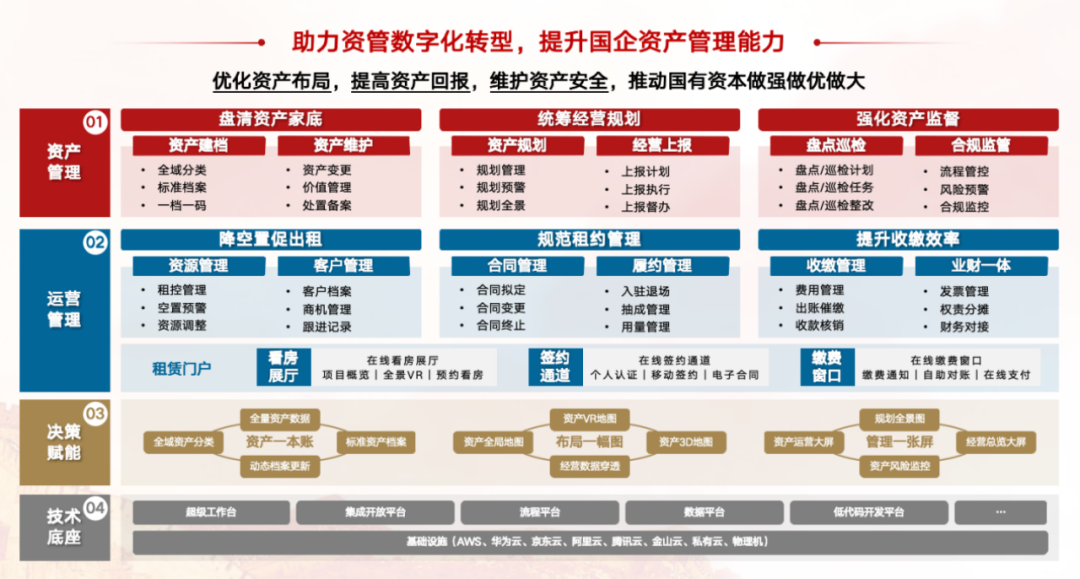 1、资产管理:盘清资产家底、统筹经营规划、强化资产监管。通过科学建档、超级台账、全景地图将资产家底彻底盘清,可轻松从宏观到微观掌握全局资产动态。