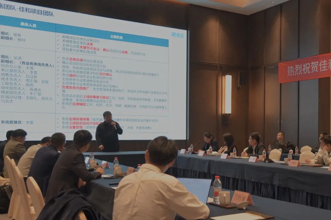 就本次项目的建设目标、计划、保障机制、后续安排等内容进行宣讲,基于对佳和集团发展现状与业务管控需求的深度调研,明源云为佳和建立了数字推动的经营管控平台,做到风险可控、数据实时可知,进而为领导决策提供支撑。