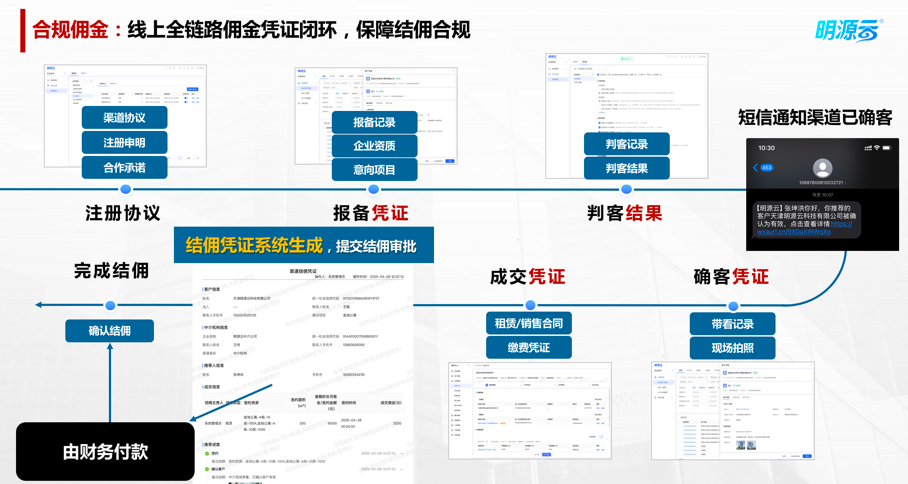 第三,国企最关注的合规结佣问题,明源云也帮大家解决了,确保了证据链完整。以深圳湾科技为例,从报备-判客-确客-成交,全流程在线,证据链完整闭环,确保渠道费用审批合规,避免扯皮。财务根据这个凭证进行付款,更及时、更合规。