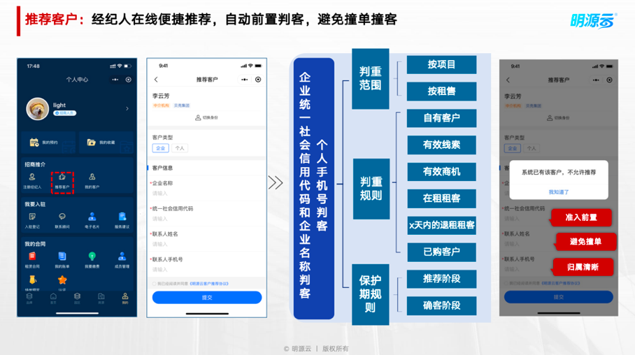 明源云的系统内置智能判客功能。针对判客的判重范围、判重规则、保护机制等,明源云沉淀了行业最佳实践,输出成熟标准固化于系统中,大幅减少人工判客带来的违规风险。