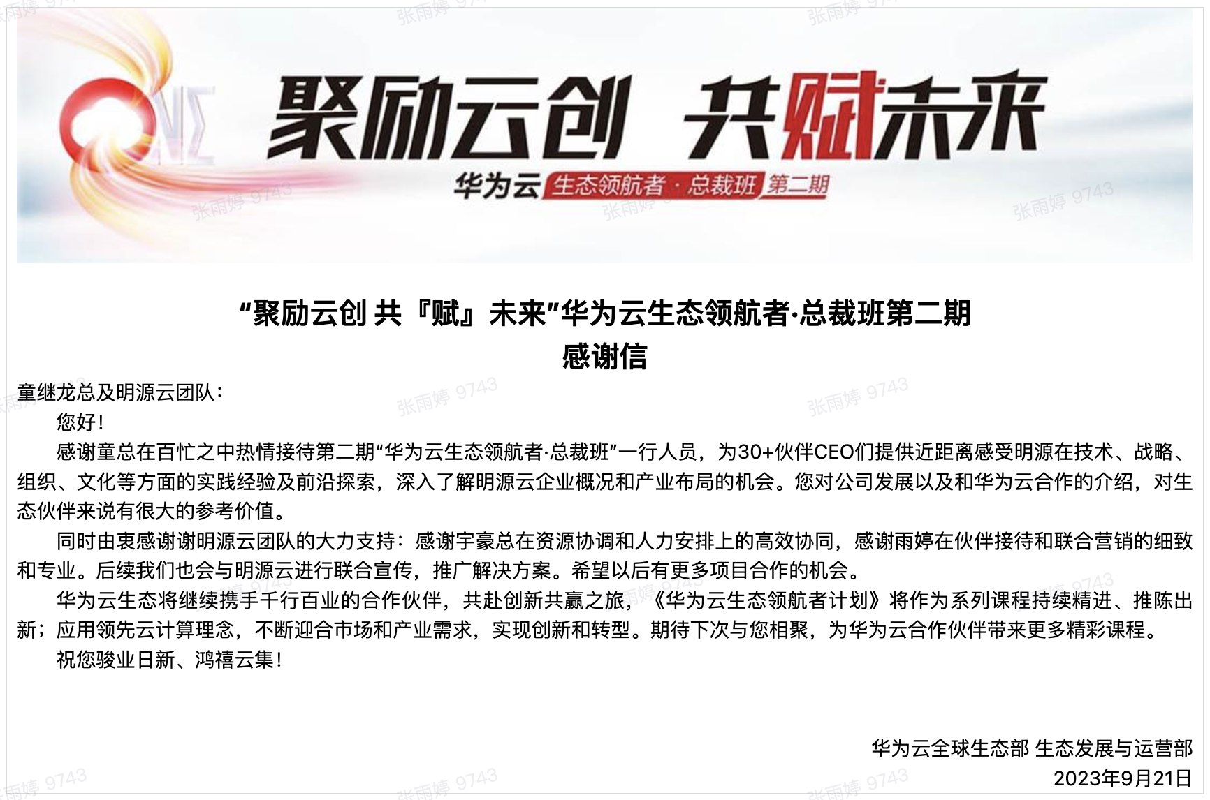 华为云生态领航者·总裁班第二期圆满结束,为企业领航者提供了一个深入了解华为云及其合作伙伴的平台,也为企业数字化转型和创新提供了有益的启示和借鉴。未来,明源云与华为云将继续携手共进,共同打造更加红火的云生态系统,为客户提供更优质的服务和解决方案,共赋未来。