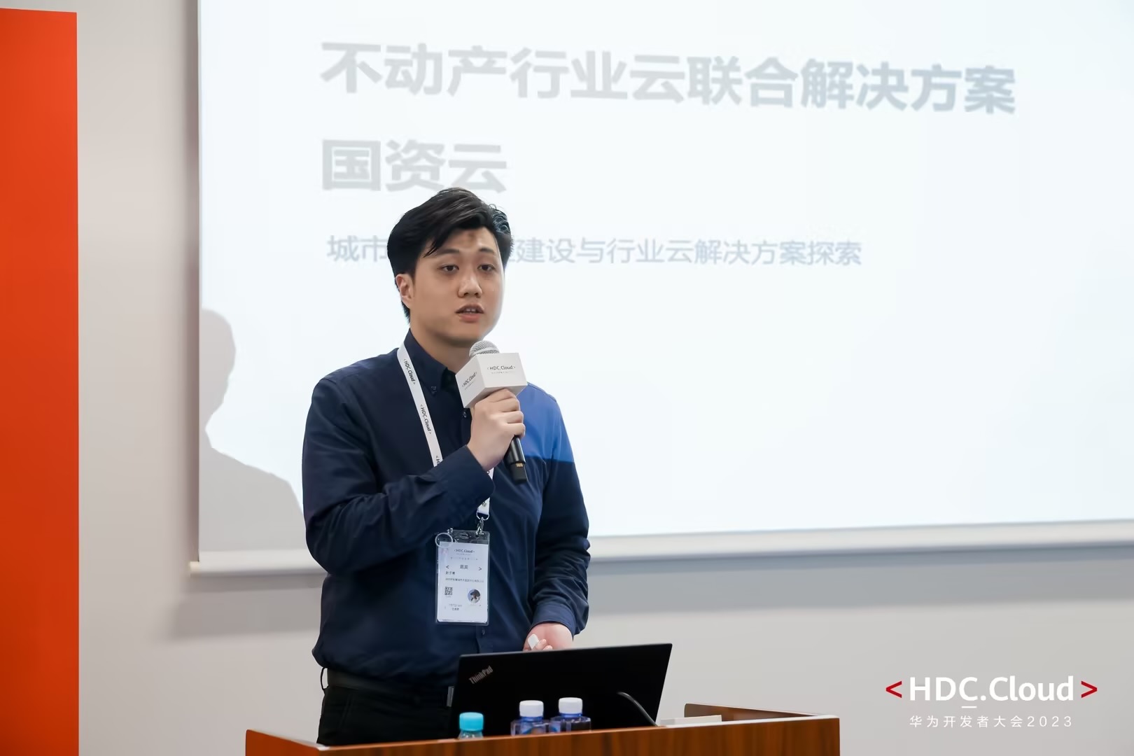 随后,深智城大数据公司商务总监谢子博分享了不动产行业云联合解决方案之国资云。“打造高标准一站式整体解决方案,助力数字政府建设”是深智城的愿景,国资云为深圳市国资委、市属国有企业提供统一的计算、存储、网络、安全云服务以及数据和技术开发支撑环境。谢子博提出,国资云将携手华为云、明源云共同健全云网底座建设,探索行业级云解决方案,为数字资产安全交汇、价值挖掘保驾护航,助力不动产国资国企数字化转型。