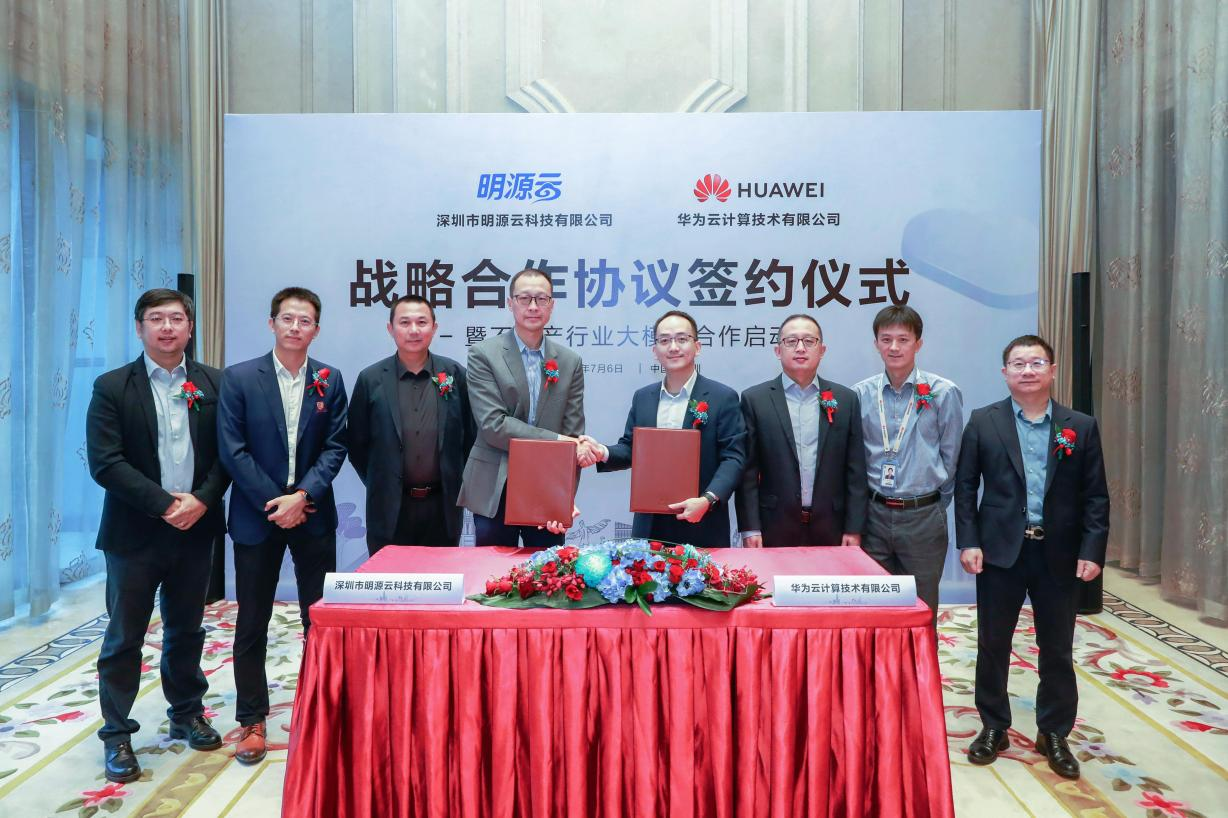 7月6日,深圳市明源云科技有限公司(以下简称“明源云”)与华为云计算技术有限公司(以下简称“华为云”)正式签署盘古大模型战略合作协议,双方将基于华为云平台打造不动产行业的AI大模型,实现不动产行业应用与服务的高度智能化发展。明源云生态合作与投资总经理吴小华与华为云深圳总经理陈航代表双方进行签约。华为云CTO张宇昕、华为云计算AI人工智能领域副总裁罗华霖、华为云深圳副总经理黄永初、明源云合伙人、联席CEO姚武、明源云合伙人、高级副总裁童继龙、明源云数字营销事业群CTO曾伟雄出席并见证签约。